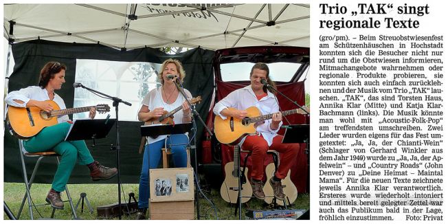 Nachbericht „Trio TAK singt regionale Texte“, erschienen am 12.09.2013 im Maintal Tagesanzeiger